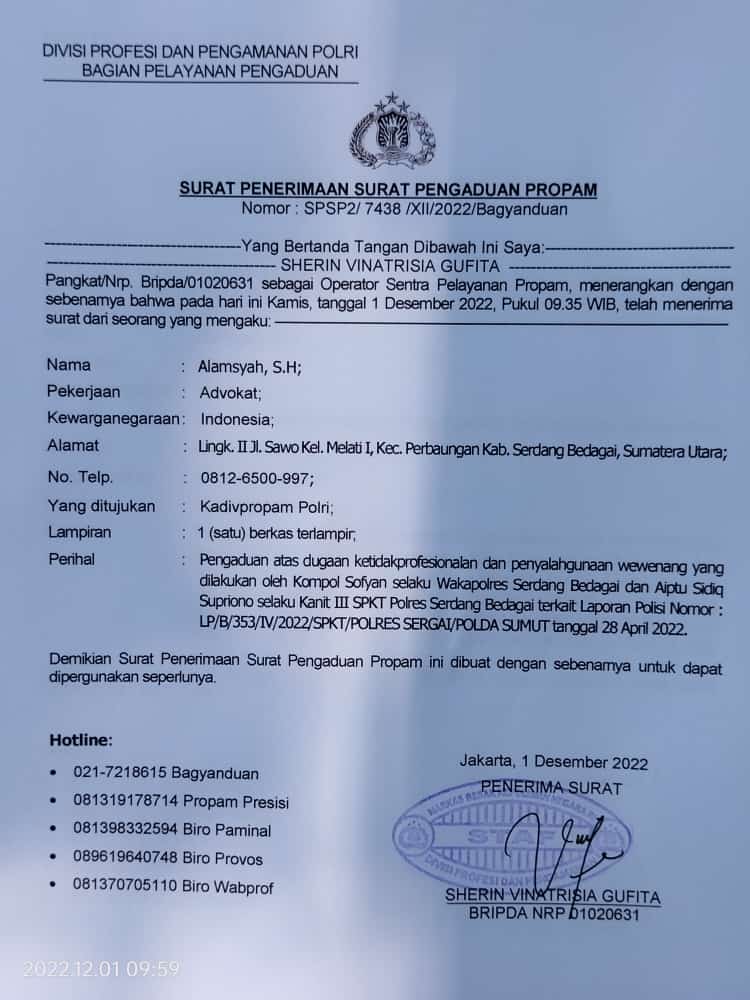 Dalam laporani ini Alamsyah SH juga mengikut sertakan Aiptu Sidiq Supriono selaku Kanit III SPKT Polres Serdang Bedagai sebagai terlapor II, Dengan pengaduan Nomor : SPSP2 /7438 /XII /2022 /Bagyandu yang diterima oleh Bripda Sherina Vinatrisia Gufita dengan NRP. 01020631.