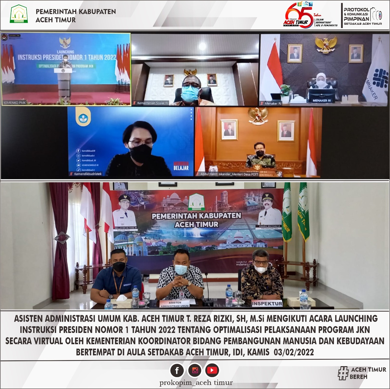 Ketigiatan tersebut Membahas tentang optimalisasi pelaksanaan Program JKN Secara virtual Oleh kementerian Koordinator bidang pembangunan dan kebudayaan yang bertempat di aula sekda kabupaten Aceh Timur, Kamis 3 Februari 2022.