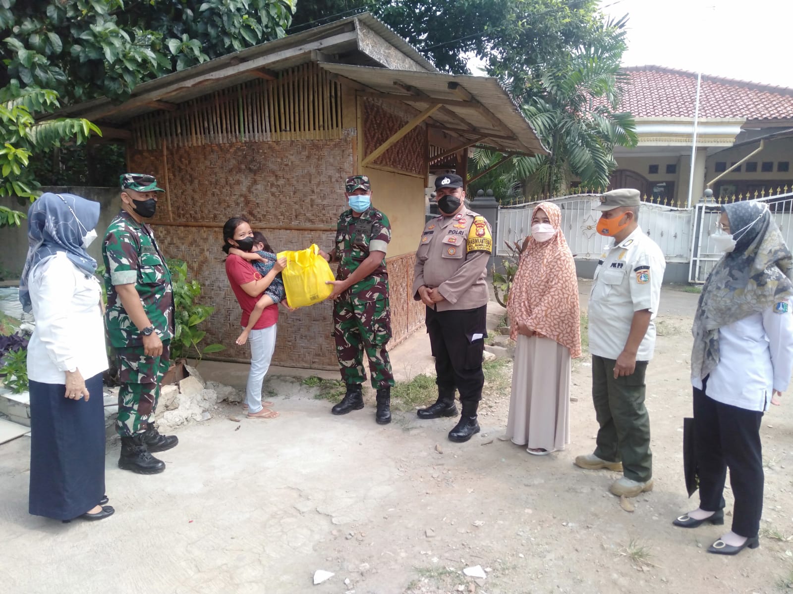 Sriwijayatoday.com Kodim 0505/Jakarta timur – Babinsa, Bhabinkamtibmas Cipayung bersama Tiga Pilar dan Puskesmas Cipayung, Bati tuud Pelda Imam memberikan bantuan sembako kepada empat (4) keluarga yang beresiko Stunting diwilayah Kelurahan Bambu Apus Kecamatan Cipayung, Selasa (19/07/22).