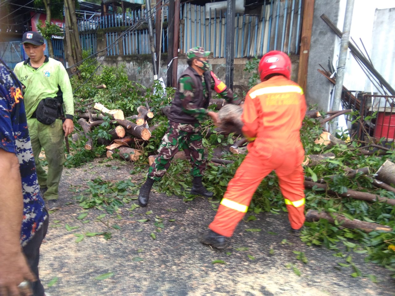 Terpantau dilokasi Babinsa bersama, Bhabinkamtibmas, Petugas Pemadan, LIingkungan Hidip, Satpol PP, PPSU dan warga secara bergotong royong memotong dan menyingkirkan pohon tersebut dari jalan raya guna menghindari kemacetan panjang.