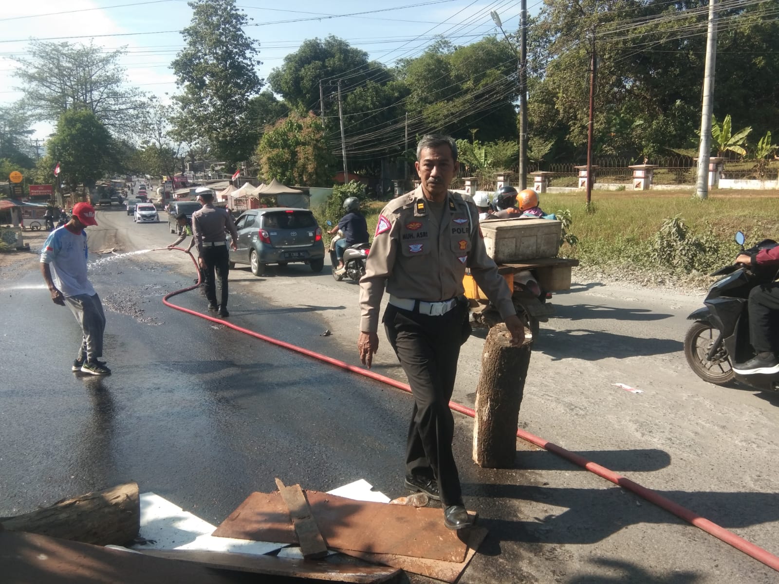 “Setelah menerima informasi dari masyarakat tentang adanya tumpahan Oli di jalan, kami bergerak cepat dengan melakukan pengaturan lalu lintas serta menaburkan pasir pada tumpahan oli agar pengendara tidak tergelincir,” ucap Muh. Asri