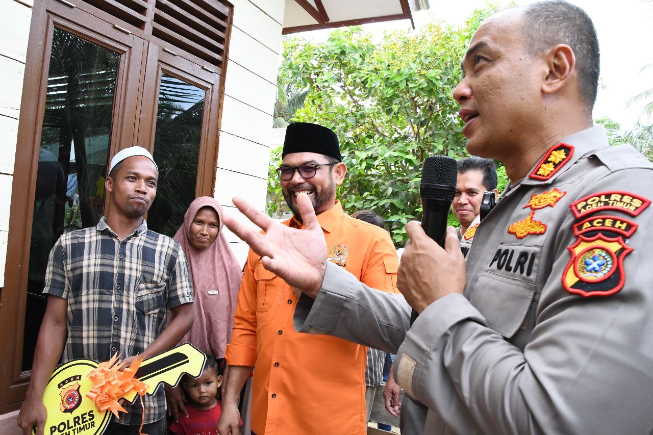 ACEH TIMUR | Anggota DPR RI Komisi III H. Muhammad Nasir Djamil didampingi Kapolres Aceh Timur AKBP Andy Rahmansyah, S.I.K, menyerahkan rumah bantuan kepada Syawaluddin warga Dusun Buket Meuriam, Gampong Panton Rayeuk M, Kecamatan Banda Alam, Kabupaten Aceh Timur, Jum’at (4/8/2023) sore.