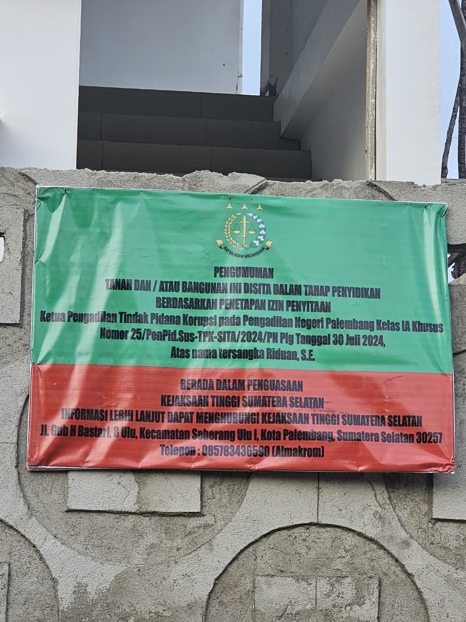 Berdasarkan surat penetapan Pengadilan Negeri Palembang Nomor 25/PenPid.Sus-TPK-SITA/2024/PN Plg tanggal 30 Juli 2024 dan surat perintah penyitaan Kepala Kejaksaan Tinggi Sumatera Selatan Nomor: PRINT-1378/L.6.5/Fd.1/07/2024 tanggal 30 Juli 2024. Tim penyidik melakukan penyitaan, Satu buah rumah yang terletak di Perum Rasan Damai Kota Sekayu Kabupaten Musi Banyuasin, Sertifikat tanah, dan Akte jual beli atas nama tersangka (R).