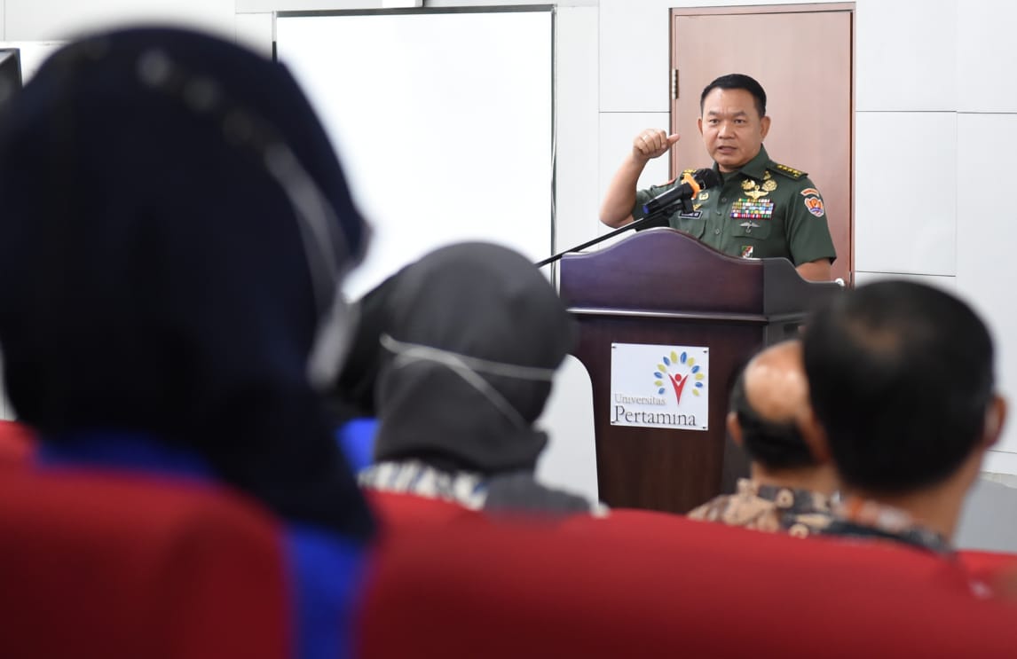 “Sejalan dengan tagline Universitas Pertamina yaitu Be Global Leaders, jadi kesempatan ini sangat tepat sekali kita mendapat kuliah tamu dari Kasad, pemimpin yang best of the best,” ucapnya.