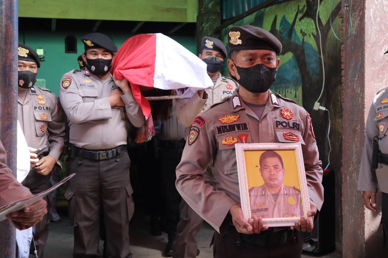 Pelaksanaan upacara pemberangkatan jenasah almarhum Aiptu Zulfidzar Effendi secara dinas Kepolisian berlangsung di Rumah duka di BTN Niaga, Desa Boddia, Kecamatan Galsel.