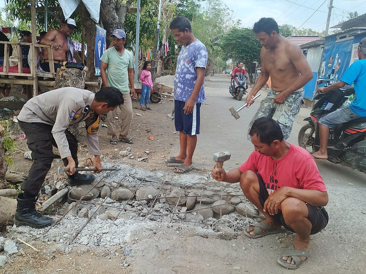 Meski cuaca panas Aipda Rajab dengan semangatnya membantu warga masyarakat bergotong royong dalam perbaikan jembatan.