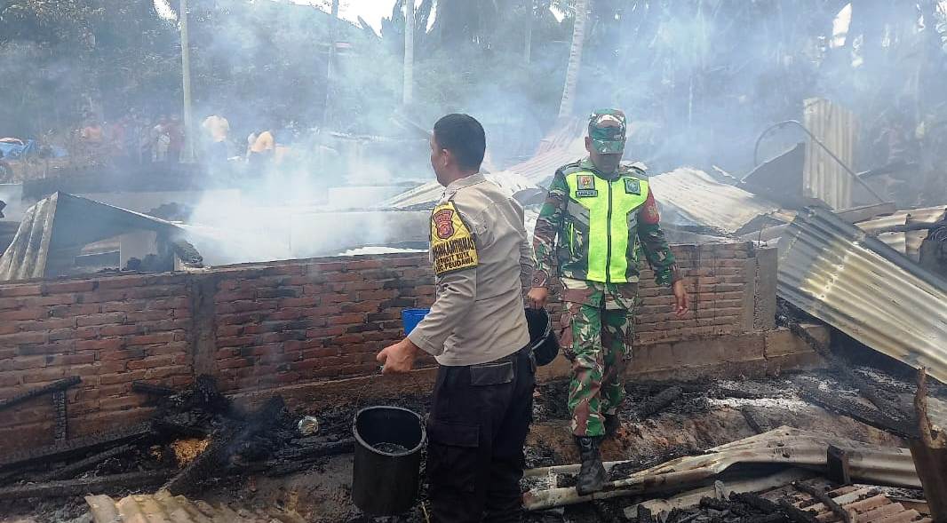 Sriwijayatoday.com | Aceh Timur – Bhabinkamtibmas Polsek Peudawa, Polres Aceh Timur, Polda Aceh Bripka Kiki Indrawan bersama Babinsa Koramil 16/PDW Kodim 0104/ATIM Serda Jumadika dan warga berjibaku memadamkan kobaran api kebakaran salah satu rumah warga.