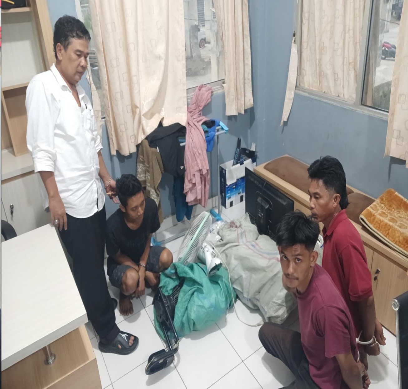 Selain mengamankan para pelaku, aparat kepolisian juga berhasil mengamankan barang bukti hasil curian berupa, dua buah kipas angin, satu unit TV, satu buah linggis, dan satu set keramik prasmanan.