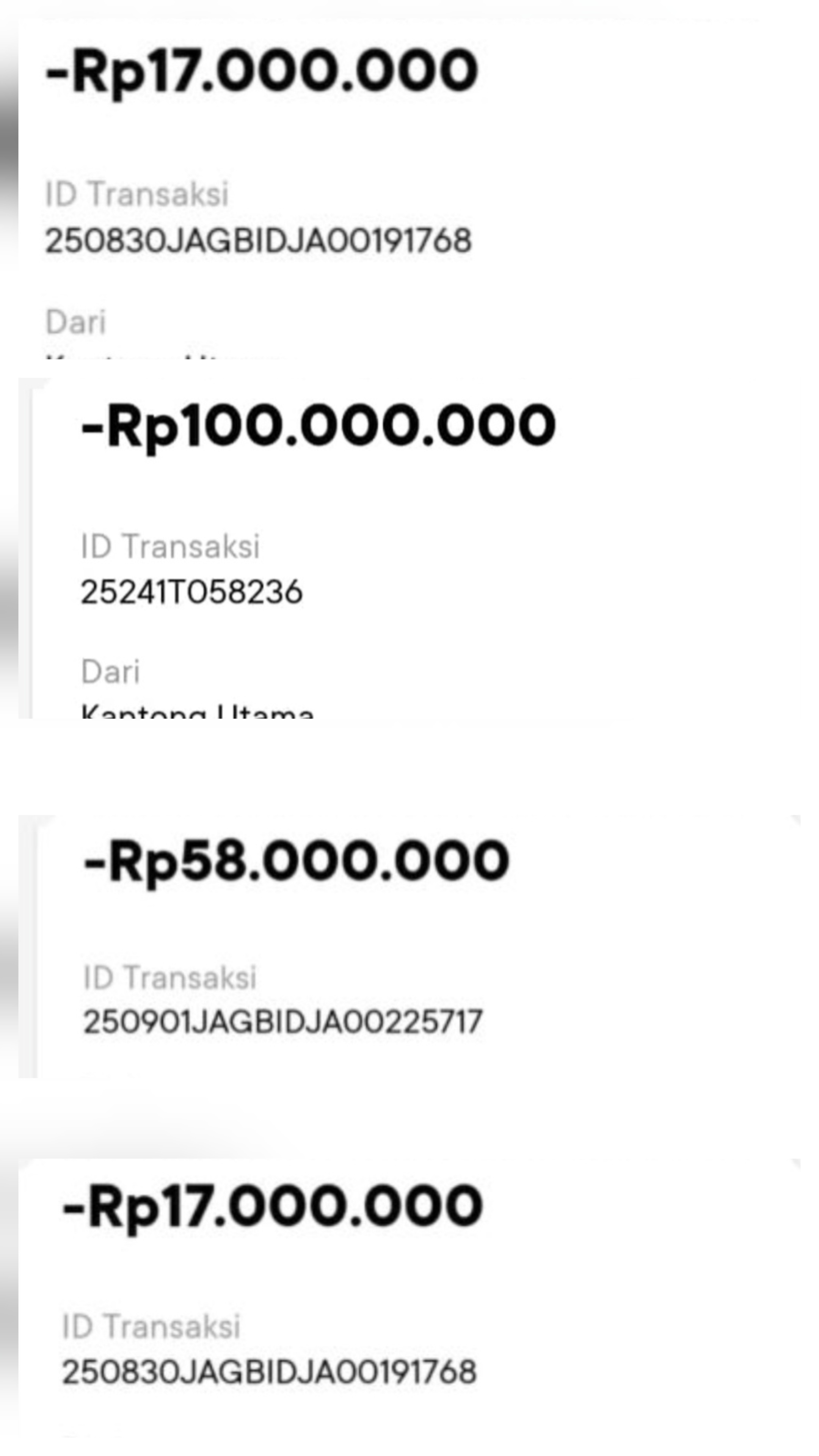 Menurut pengakuan keluarga, pembayaran dilakukan secara bertahap melalui transfer bank, salah satunya senilai Rp50 juta pada tanggal 1 September 2025.