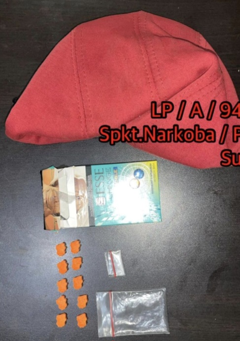 Dari penangkapan ini, saat penggeledahan aparat kepolisian menemukan barang bukti sepuluh butir pil TMT warna orange yang diduga narkotika jenis pil ekstasi dibungkus plastik klip bening di dalam sebuah kotak rokok merek Esse Double Change, dan satu paket sabu dibungkus plastik klip bening yang diselipkan didalam topi oleh pelaku.