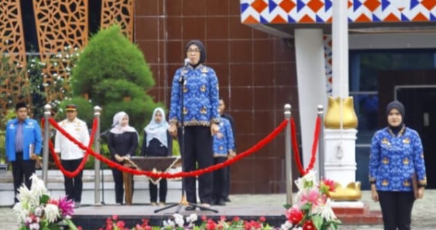 Bupati Way Kanan, Ayu Asalasiyah, S.Ked., bertidak selaku Pembina Upacara membacakan sambutan Menteri Pemuda dan Olahraga Republik Indonesia, Erick Tohir.