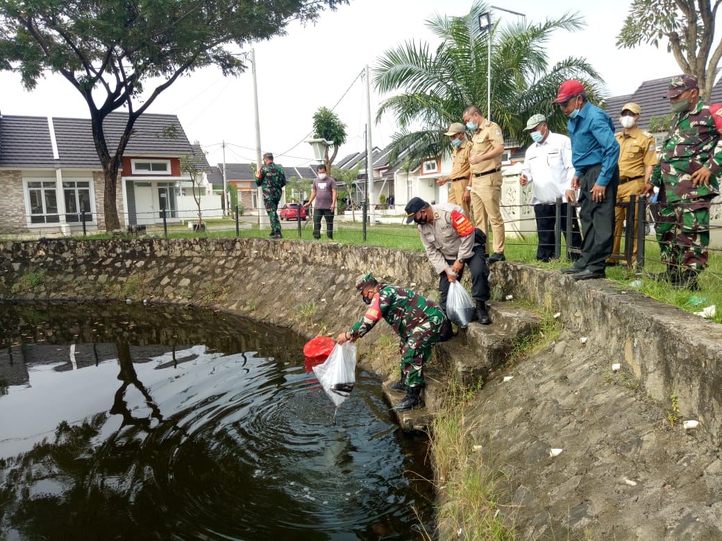 sriwijayatoday.com Kodam Jaya, Kota Bekasi – Mayor Inf Rahmat Triono, S.Ag., M.M., Danramil 02/Pondok Gede Kodim 0507/Bekasi bersama Camat Pondok Melati ASN Jaya Eko, S.Ip, Lurah Jati Murni Bapak Abdul Barkah Kapolsek Pondok Gede diwakili Ipda Ervan Babinsa dan Bhabinkamtibmas, tebar 5000 ekor benih ikan lele, di Tandon Air/Waduk Perumahan Spring Garden Jln. Rambutan RT.05 RW.03, Kelurahan Jati Murni, Kecamatan Pondok Melati, Kota Bekasi, Jawa Barat. Senin (07/06/2021).