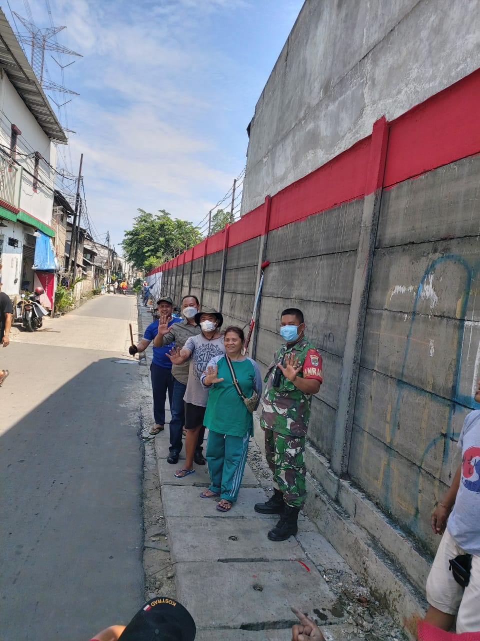 Terlihat antusiasme Babinsa bersama warga Rt 11 Rw 09 yang di pimpin langsung oleh Ketua Rt.11 Ibu Puji dalam membantu pengecatan di sepanjang tembok beton PT.BMC ( Baja Multi Cakra ).