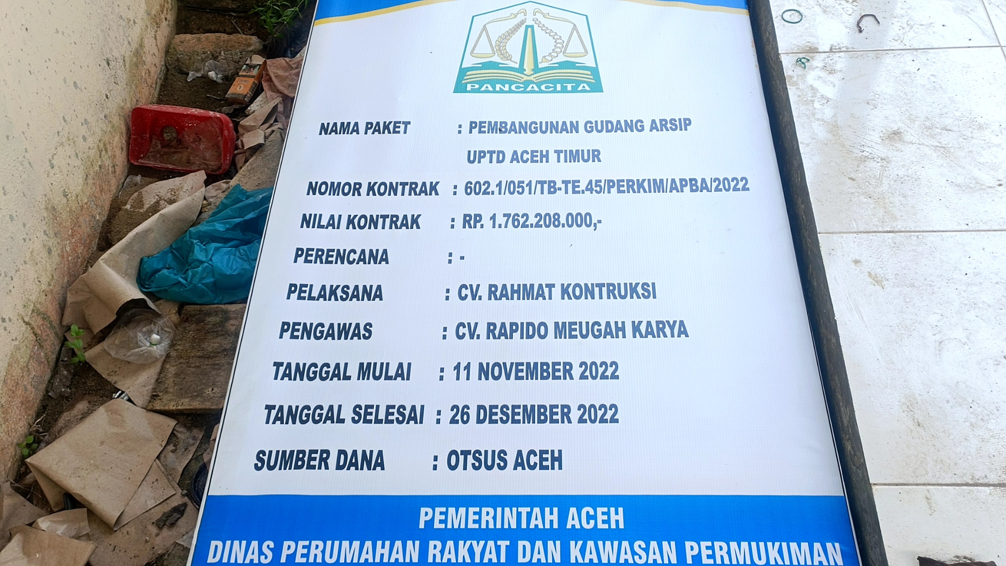 Sriwijayatoday.com | Aceh Timur – Proyek pekerjaan pembangunan Gedung Arsip UPTD Aceh Timur yang di kerjakan oleh CV. RAHMAT KONTRUKSI dengan konsultan pengawasnya, CV. RAPIDO MEUGAH KARYA. Nomor Kontrak : 602.1/051/TB – TE.45/Perkim/APBA/ 2022. Dan nilai kontrak Rp. 1.762.208.000. (Satu Milyar Tujuh Ratus Enam Puluh Dua, Dua Ratus Delapan Ribu Rupiah), yang bersumber dari APBA Otsus Aceh 2022.