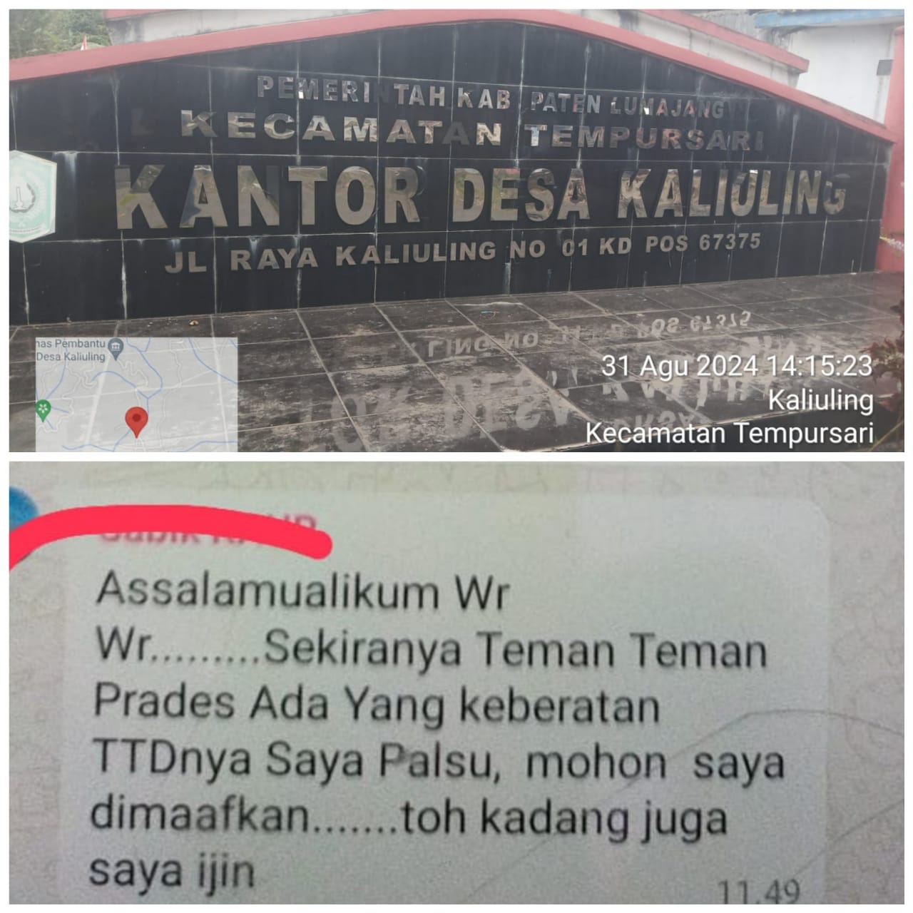 Saat klarifikasi berlangsung tiba tiba SEKDES mendapati pesan WhatsApp group prades yang isinya himbauan dari KADES agar semua perangkat DESA harus hadir semua pada hari Senin, dan diwaktu yang sama dalam grup yang sama juga muncul pesan permohonan maaf dari SABIK KAUR yang isi pesannya memohon maaf “sekiranya temen temen Prades ada yang keberatan TTD nya saya palsu mohon saya dimaafkan toh kadang juga saya izin”.