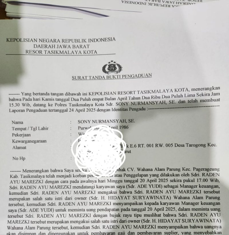 Dalam laporan yang tercatat di Surat Tanda Bukti Pengaduan, Sony Nurmansyah menjelaskan bahwa peristiwa bermula pada Minggu, 20 April 2025 sekitar pukul 17.00 WIB di CV. Wahana Alam Parung, Kecamatan Pagerageung, Kabupaten Tasikmalaya. Sdri. Raden Ayu Marezki diduga mendatangi Manajer Keuangan perusahaan, Sdr. Ade Yudi, dengan mengaku sebagai salah satu istri dari pemilik usaha, Sdr. H. Hidayat Suryawinata.
