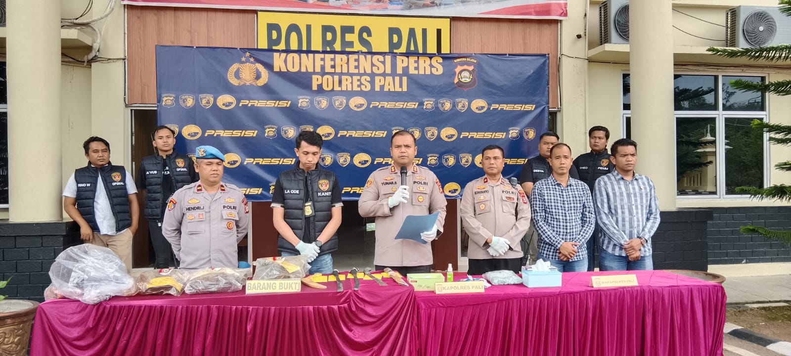 Kapolres PALI AKBP Yunar Hotma Parulian Sirait, S.H., S.I.K., M.I.K., didampingi Kasat Reskrim AKP Nasron Junaidi, S.H., M.H., serta para Pejabat Utama (PJU), membenarkan penangkapan tersebut saat konferensi pers, Selasa (27/1/2026).