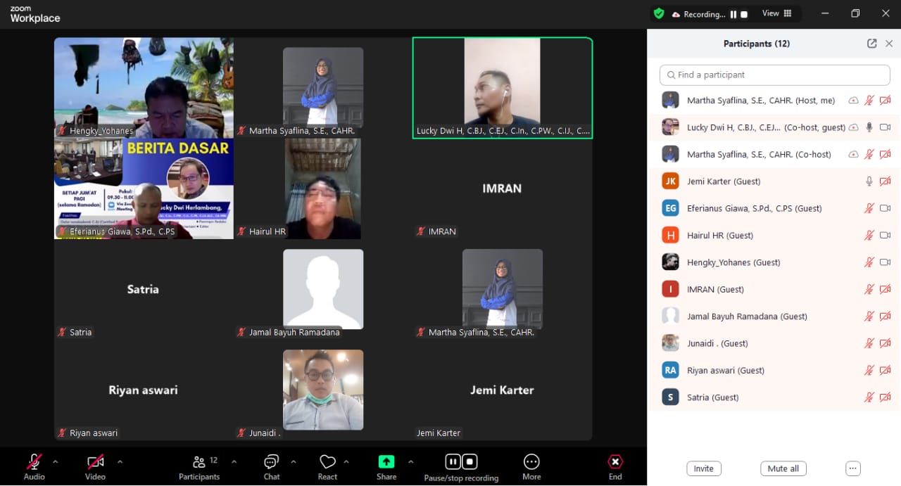 Sriwijayatoday.com // PALI – Enam Orang warga Kabupaten Penukal Abab Lematang Ilir (PALI) yang berprofesi sebagai wartawan mengikuti pendidikan dan pelatihan dasar jurnalistik di MZK Institute, sebuah pusat pembelajaran atau lembaga yang terakreditasi oleh Lembaga Sertifikasi Profesi Badan Nasional Sertifikasi Profesi (BNSP). Pelatihan ini diadakan secara online melalui Zoom pada Jumat, 19 Juli 2024, dari pukul 19.30 hingga 22.00 WIB.
