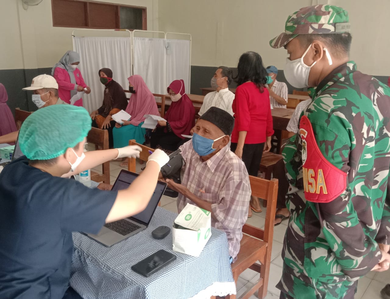 ” Dalam kegiatan pemantauan, petugas menghimbau warga calon penerima vaksin, agar tetap disiplin dan tidak mengabaikan protokol kesehatan waspada Covid-19