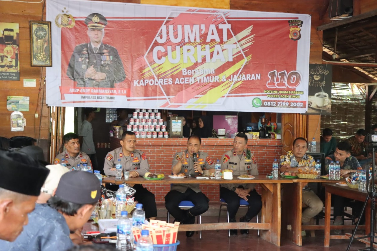 “Terlebih lagi dengan adanya Jumat Curhat ini sehingga warga dapat leluasa mengutarakan isi hati dan pikiran kepada anggota Polri, dengan demikian dapat meningkatkan kinerja Kepolisian menjadi lebih baik dan tepat sasaran.” Jelas Kapolres Aceh Timur AKBP Andy Rahmansyah, S.I.K.