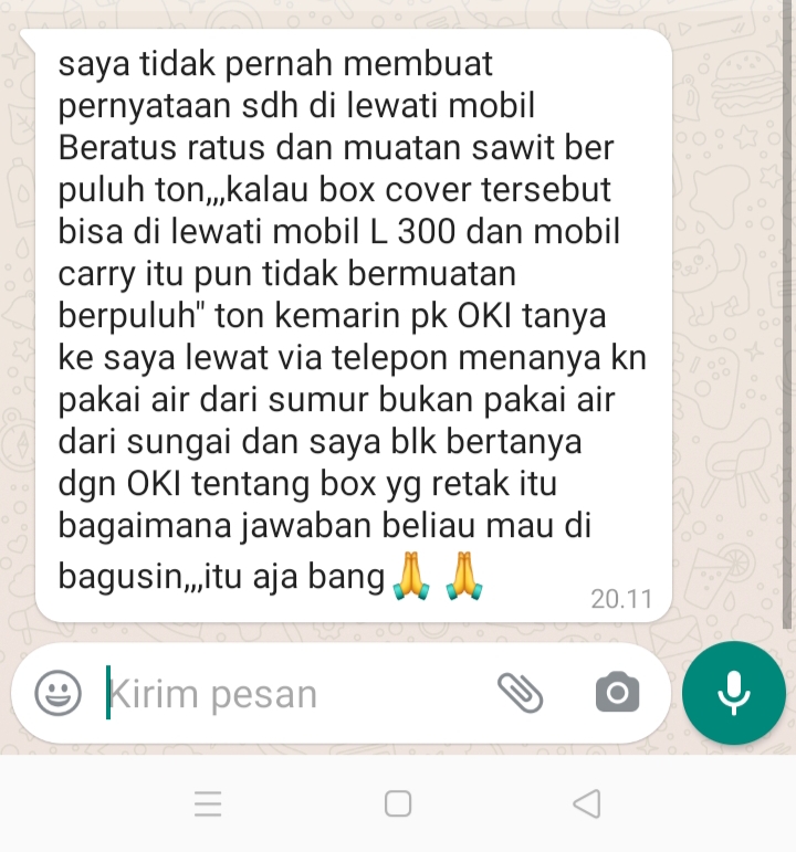 “saya tidak pernah membuat pernyataan sudah di lewati mobil Beratus ratus dan muatan sawit berpuluh ton, kalau box culvert tersebut bisa di lewati mobil L 300 dan mobil carry itu pun tidak bermuatan berpuluh” ton, kemarin pak OKI tanya ke saya lewat via telepon menanyakan pakai air dari sumur bukan pakai air dari sungai. dan saya balik bertanya dgn OKI tentang box yg retak itu bagaimana, jawaban beliau mau di bagusin, itu aja bang, “Bantahnya. Jumat(12/11/2021). (pkr)