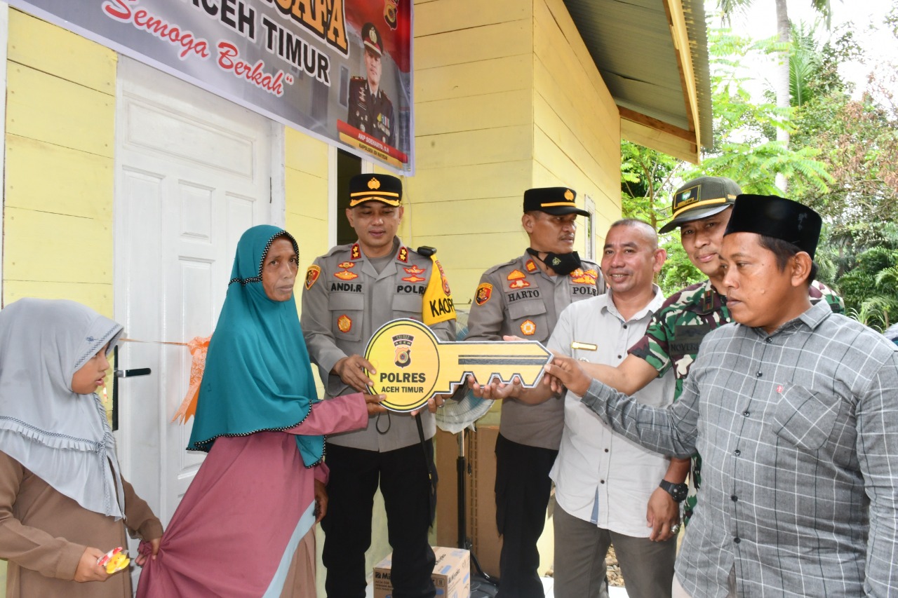 Rumah Bantuan Polres Aceh Timur yang diserahkan Kapolres, merupakan rumah semi permanen dengan ukuran 5×7 meter yang telah dilengkapi dengan fasilitas kebutuhan rumah tangga seperti kasur, pompa air dan peralatan dapur ini merupakan program unggulan Polres Aceh Timur yang akan berkesinambungan dengan menyasar warga kurang mampu yang rumahnya tidak layak huni.