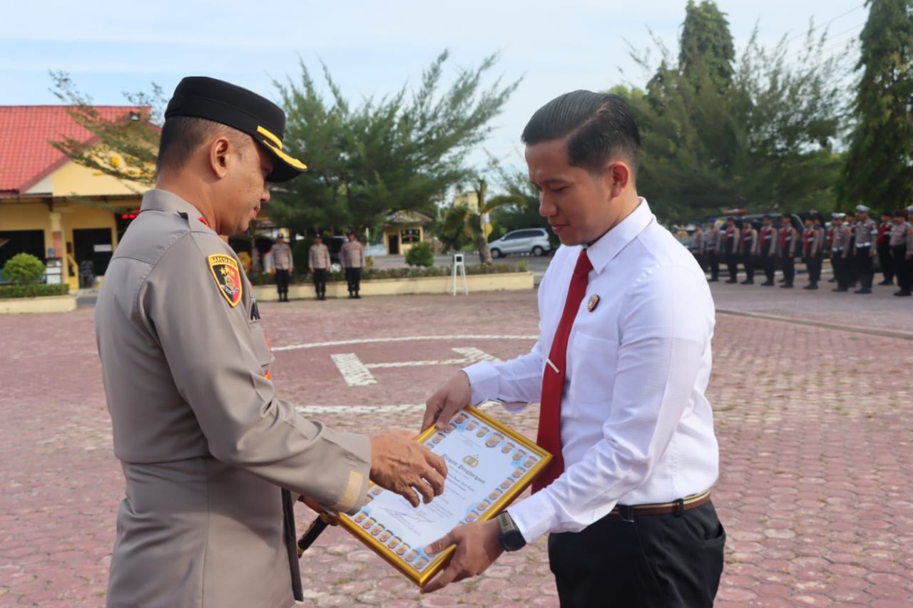 Pemberian reward berlangsung di Lapangan Apel Sarja Arya Racana dipimpin Kapolres Aceh Timur AKBP Andy Rahmansyah, S.I.K. dihadiri Pejabat Utama (PJU) Polres Aceh Timur dan para kapolsek, Senin (08/05/2023).