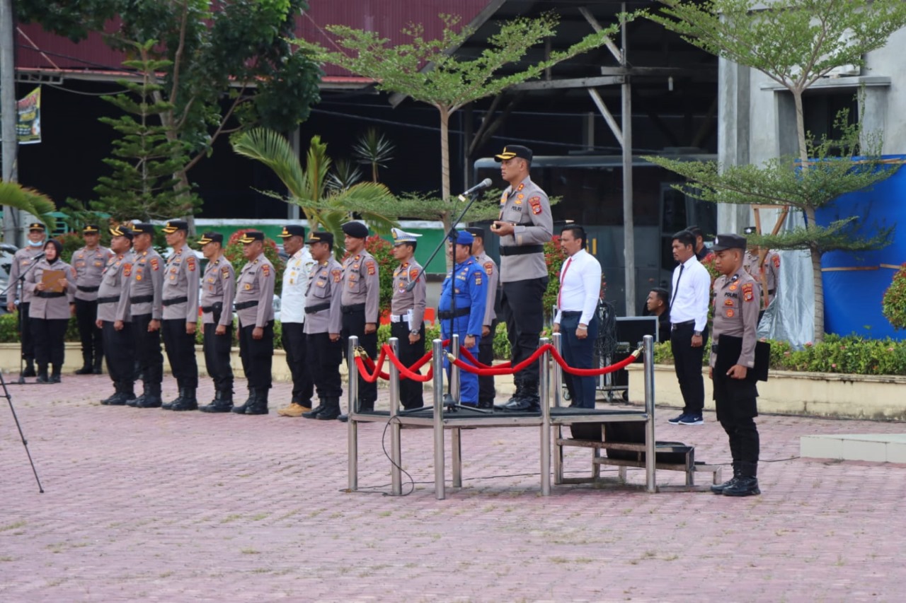 ACEH TIMUR — Kapolres Aceh Timur AKBP Andy Rahmanyah, S.I.K.,S.H.,M.H. pimpin Apel Gelar Polisi RW/Dusun di Lapangan Apel Sarja Arya Racana, Kamis, (12/10/2023) pagi.