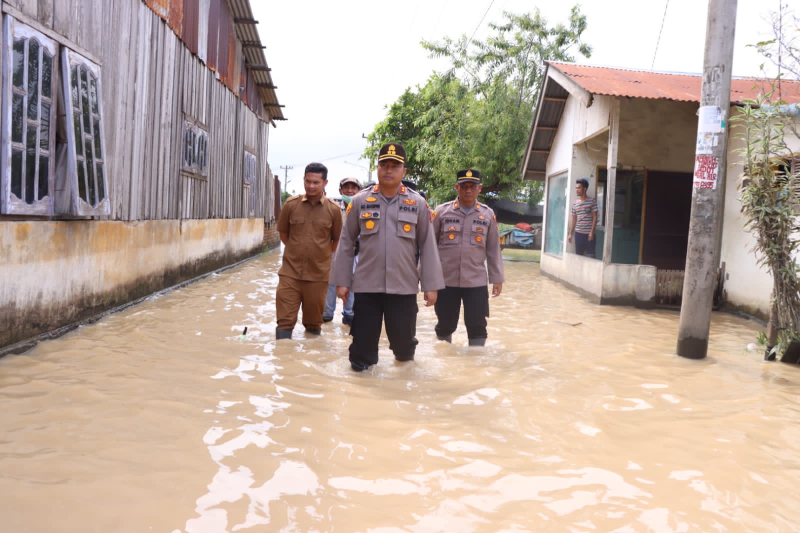Selanjutnya Kapolres Sergai bersama dengan rombongan mengecek pendirian posko kesiapsiagaan banjir yg didirikan oleh Polres Sergai di lokasi banjir tersebut serta rumah – rumah yang terkena banjir.