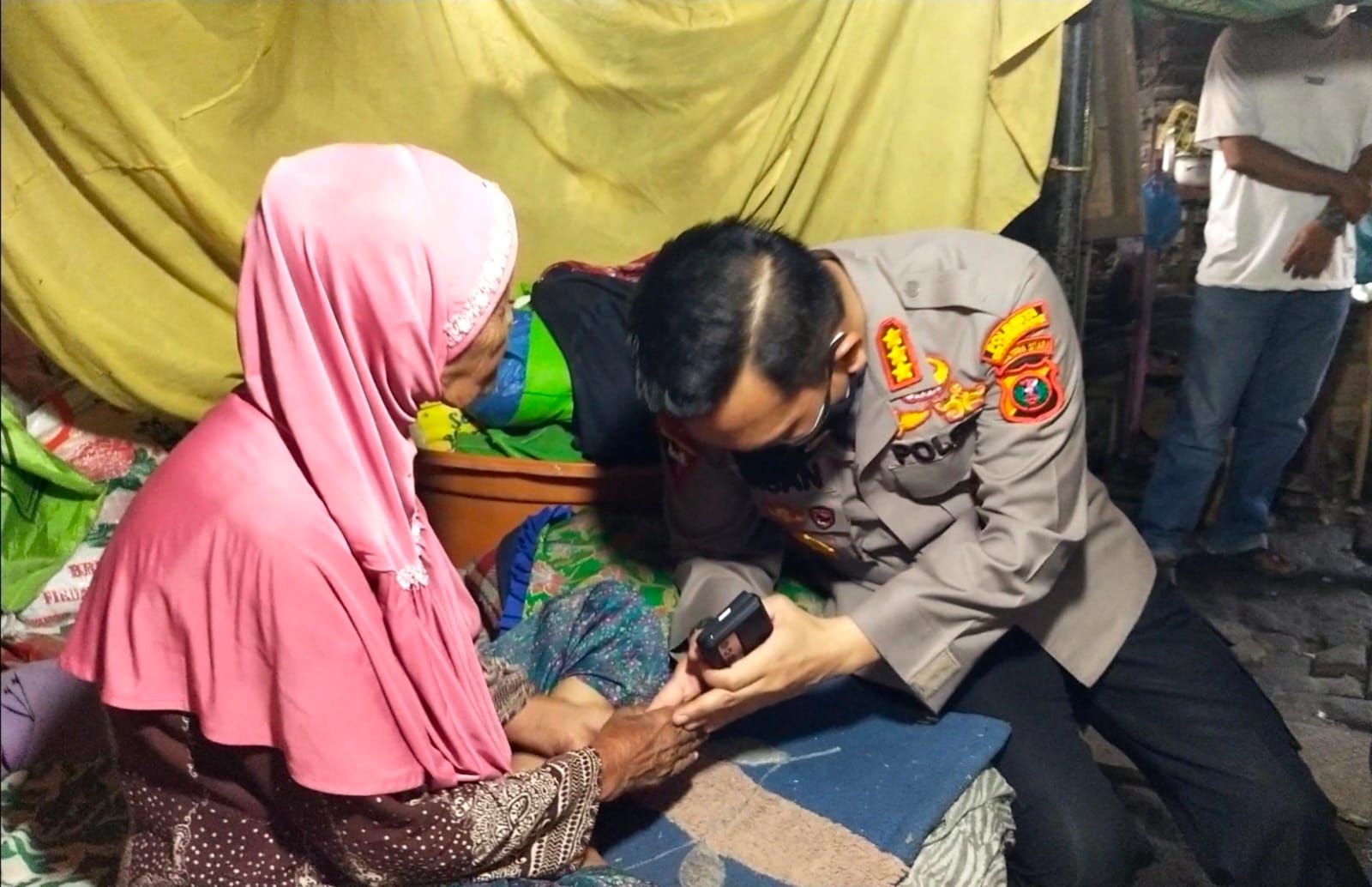 Suasana dalam rumah ibu Nurjannah br. Lubis seketika pun terlihat begitu penuh keharuan dengan kehadiran sosok Kapolresta Deli Serdang duduk disamping ibu Nurjannah br. Lubis berdialog penuh keakraban sambil menyerahkan bantuan, kasur, Dispenser air minum, mie Instan,mukenah, dua papan telur ayam, dan sembako serta bekal pegangannya.