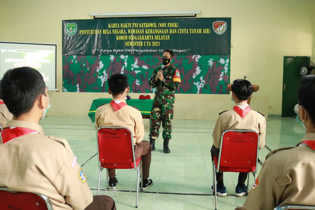 Sriwijayatoday.com Kodam Jaya, Jaksel – Selain Melaksankan kegiatan fisik, giat Program Karya Bakti TNI Satkowil Kodim 0504/JS Semester I TA 2021 juga melaksankan kegiatan non fisisk, salah satu diantaranya Kodim 0504/JS melaksanakan penyuluhan wawasan kebangsaan kepada anggota Pramuka Saka Wira Kartika yang bertempat di Aula Makodim 0504/JS, Jl. Cendrawasih Raya, Kel. Keb. Lama Selatan, Kec. Keb. Lama, Jakarta Selatan. Selasa (20/4/2021).