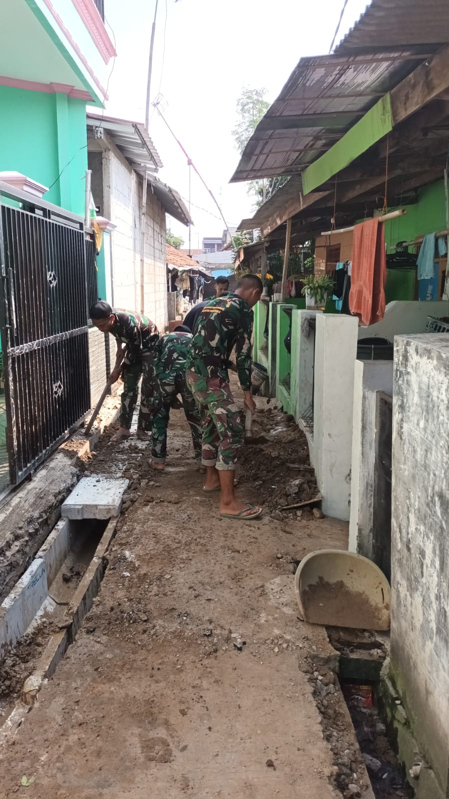 Puluhan personil anggota satgas TMMD, masih terlihat menggali parit sepanjang jalan kampung di Rt.01/01, Kelurahan Teluk Pucung, Kecamatan Bekasi Utara, Kota Bekasi. Kesibukan merampungkan obyek pembangunan Drainase di TMMD 113 masih terus dikebut guna kejar target sesuai waktu yang direncanakan, Drainase yang dibangun sepanjang kurang lebih 1200 meter ini nantinya akan digunakan saluran air warga yang selama ini manpet dan menggenang pada saat hujan.