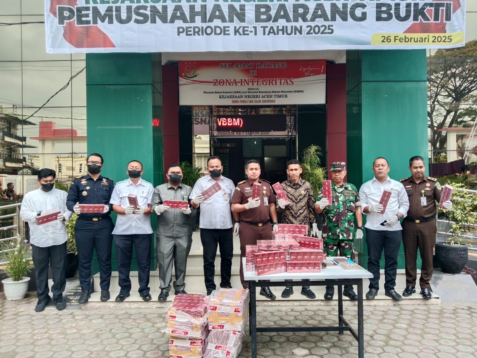 Pemusnahan barang bukti yang dilakukan Kejari aceh timur, diantaranya 1 juta bungkus rokok ilegal,tiga unit HP nokia model TA-1465 dan satu unit HP oppo color OS 13