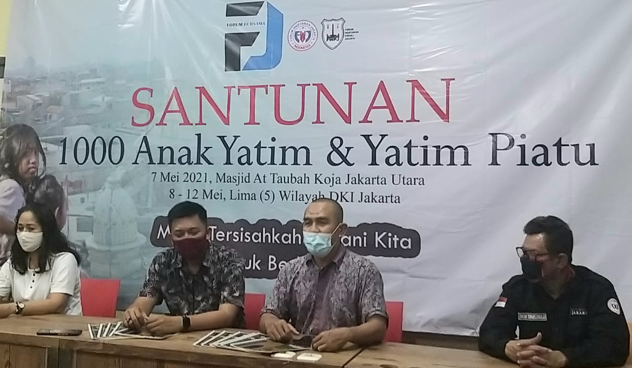 “Bismillahirrahmanirrahim. Insya Allah kami, dua forum wartawan yaitu Forum Wartawan Peduli Jakarta (FWPJ) dan Forum Wartawan Jakarta (FWJ) Indonesia bersinergi dalam sebuah Forum Bersama. Kami sepakat akan menggelar Santunan 1000 Anak Yatim dan Yatim Piatu di Masjid At-Taubah, Koja Utara, Jakut, pada Jumat siang sekitar pukul 14.00 WIB, 7 Mei 2021, “kata Agus di Kantor Sekretariat Forum Bersama, Jl. Dr. Saharjo, No. 238, Karet Kuningan, Setiabudi, Jakarta Selatan.