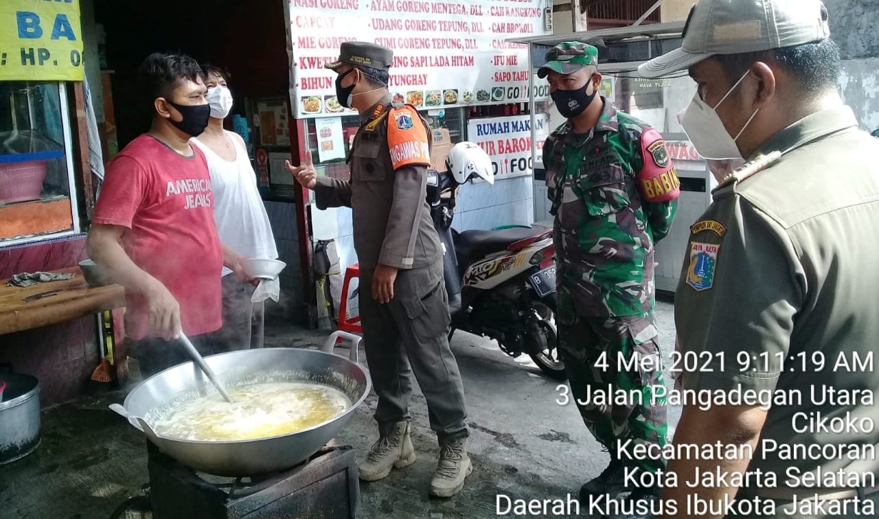 Sriwijayatoday,com Kodam Jaya, Jaksel – Petugas Gabungan dari Koramil 02/Mampang Prapatan, Polsek dan Satpol PP Pancoran (Tiga Pilar), melaksanakan kegiatan pengawasan Pemberlakuan Pembatasan Kegiatan Masyarakat (PPKM), dengan memberikan himbauan kepada pelaku usaha agar tetap menerapkan protokol kesehatan.