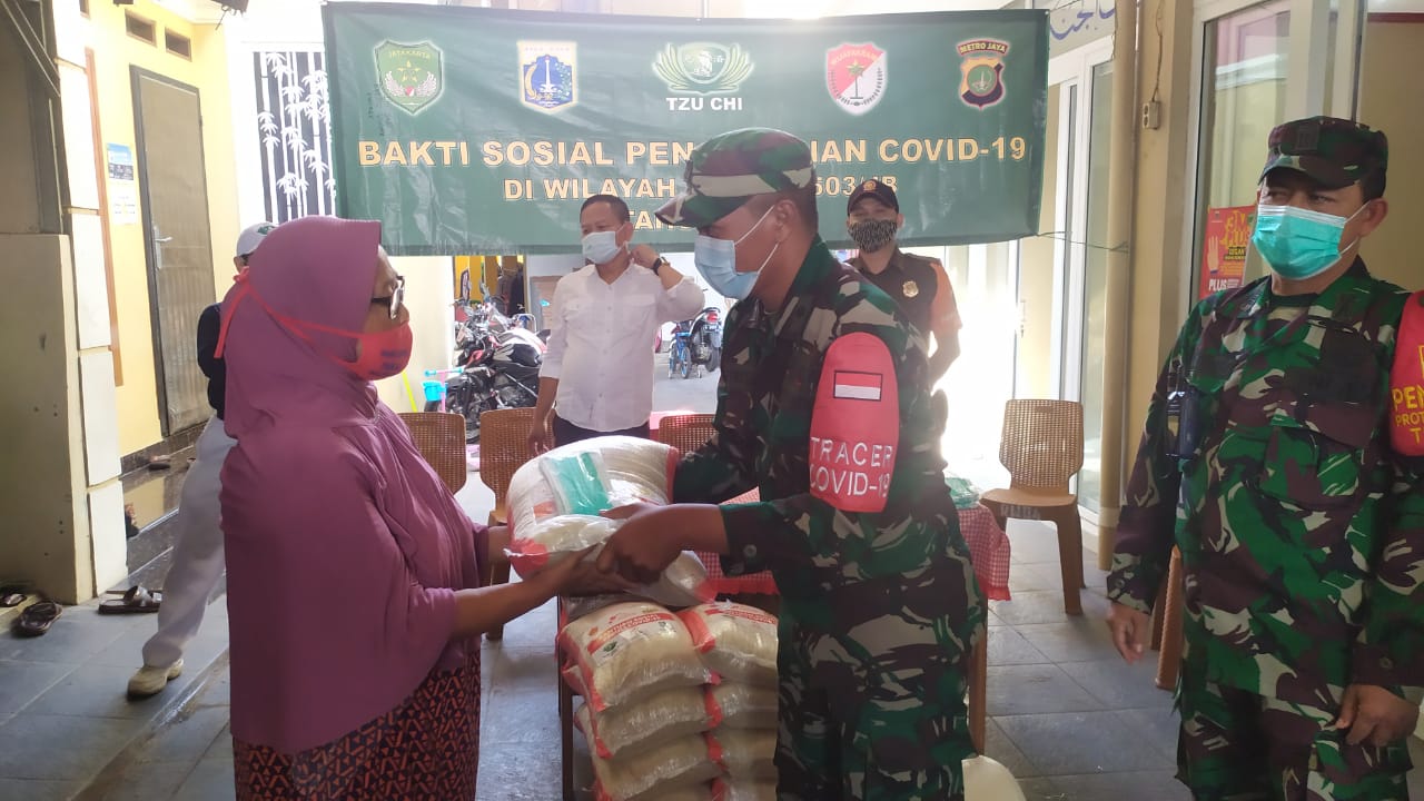 “ Kegiatan Pembagian Bantuan Sosial ini terlaksana atas kerjasama Yayasan Budha Tzu Chi dengan Kodim 0503/JB melalui Koramil 06/KD dalam rangka membantu meringankan beban warga yang terdampak pandemi Covid-19”, ungkap Danramil.