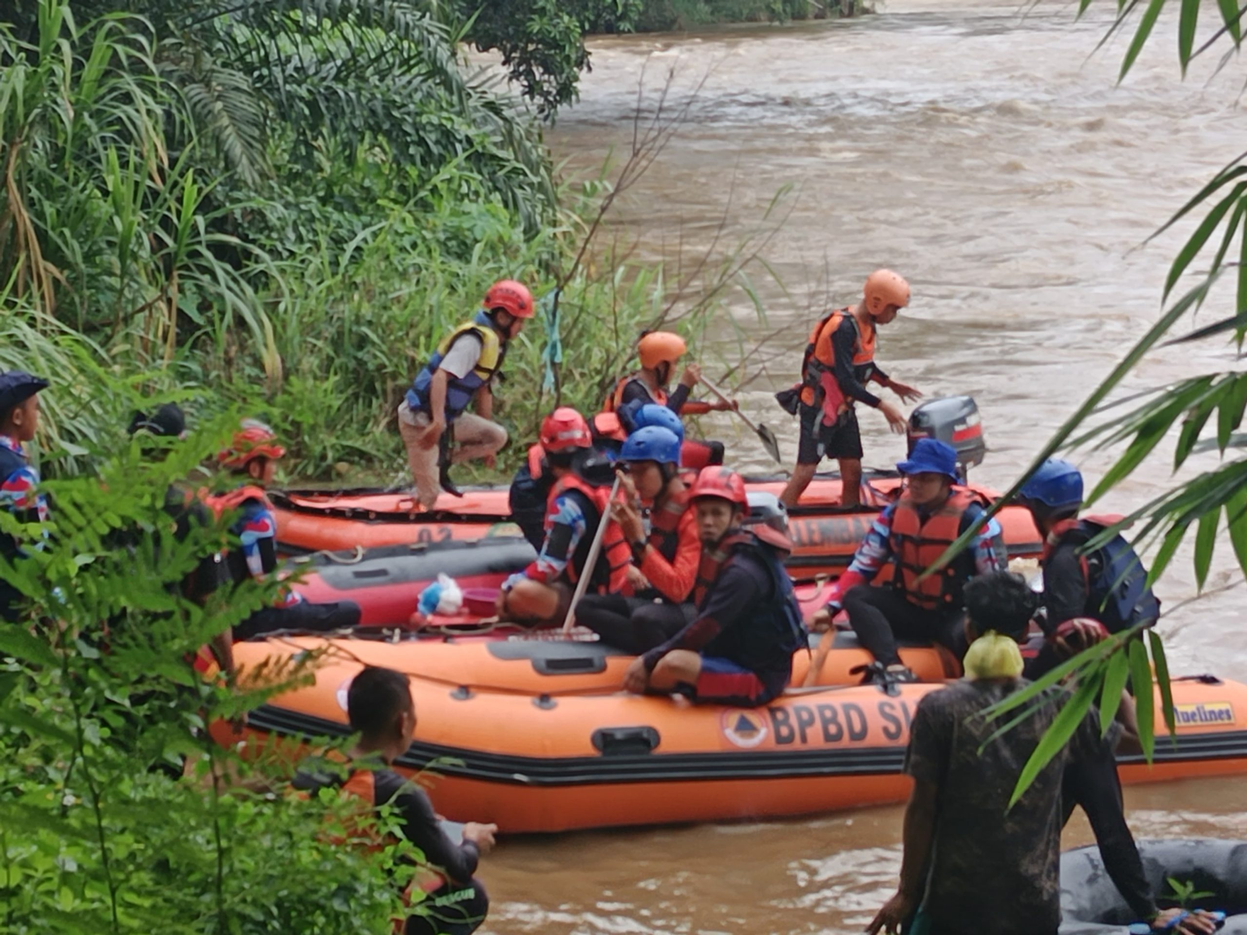 Tim Sar Gabungan BPBD Kabupaten Muara Enim, tengah menyusuri Sungai Enim menggunakan perahu karet, melakukan pencarian korban hanyut. Rabu, (29/01/2025). Lokasi : Desa Pandan Enim, Kecamatan Panang Enim, Kabupaten Muara Enim. (Dokumentasi : Sriwijayatoday.com)