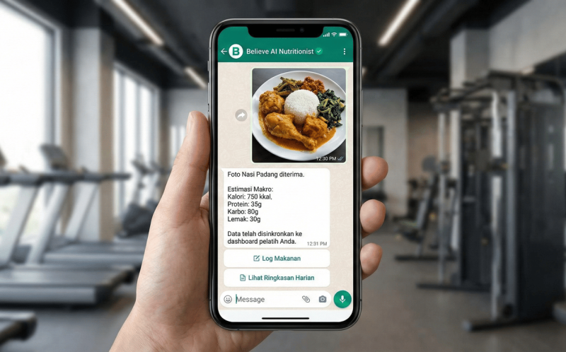 Di Believe Fitness, solusinya semudah memotret makanan Anda. Cukup kirimkan foto hidangan Anda ke WhatsApp bot internal Believe. Sistem AI akan membedah visual tersebut, mengekstraksi data makro (Kalori, Protein, Karbohidrat, Lemak) secara presisi, dan mengirimkannya langsung ke dashboard analitik pelatih Anda secara real-time. Aliran data tanpa hambatan inilah yang menjadikan Believe transformation gym dengan rekam jejak keberhasilan tertinggi di kawasan ini.