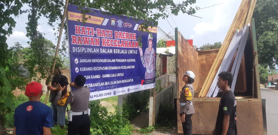 SRIWIJAYATODAY.COM // GOWA-SULSEL, Berbagai upaya terus dilakukan jajaran Sat Lantas Polres Gowa untuk meminimalisir terjadinya kecelakaan lalu lintas di wilayah Kabupaten Gowa, salah satu diantaranya yakni dengan menggelar pemasangan spanduk di beberapa titik ruas jalan raya.
