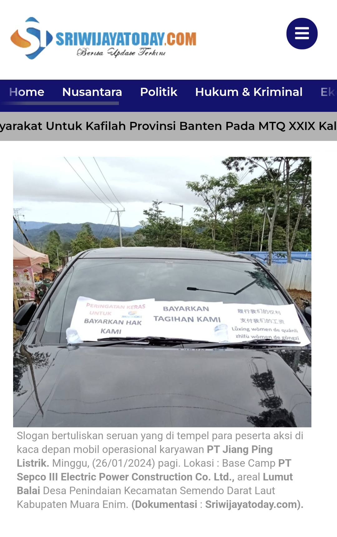 Laman berita Kabar Aksi Protes Ratusan Karyawan PT Jiang Ping Listrik Subcon PT Sepco III Electric Power Construction Co. Ltd., Lumut Balai Semendo. (Dokumentasi, Sriwijayatoday.com)