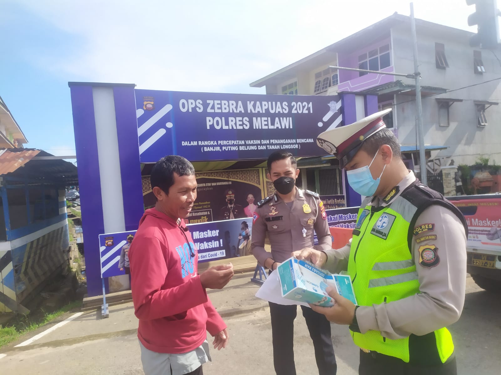Kamis (18/11) Personil Polres Melawi yang terlibat dalam Ops Zebra Kapuas 2021 melaksanakan pembagian masker dan brosur Ayo pakai masker dan ajakan vaksin di lampu merah tugu juang Nanga Pinoh Melawi.