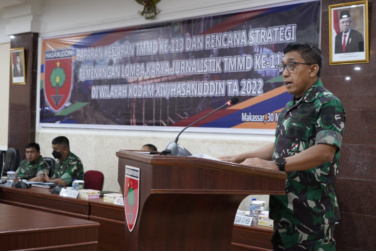 Sriwijayatoday.com Makassar-Sulsel, Pangdam XIV/Hasanuddin Mayjen TNI Andi Muhammad, S.H., terima paparan kesiapan TMMD ke-113 dan Rencana Strategi Pemenangan Lomba Karya Jurnalistik (LKJ) TMMD ke-113 di Wilayah Kodam XIV/Hasanuddin Tahun 2022, bertempat di ruang Bina Yudha II Makodam Jl. Urip Sumoharjo Makassar, Rabu (30/03/2022).