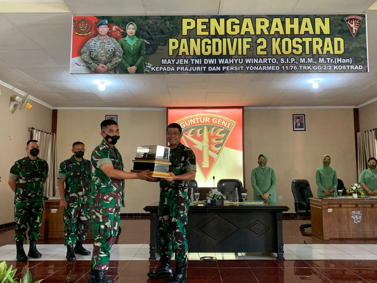 Kunjungan Pangdivif 2 Kostrad diawali dengan melaksanakan protokol kesehatan yaitu mencuci tangan dan cek suhu tubuh. Laporan Wadanyonarmed 11 Kostrad serta jajar kehormatan dari regu Dinas Keamanan menyambut hangat kedatangan Pangdivif 2 Kostrad di satuan yang memiliki Alutsista Meriam 76 mm gunung. Kegiatan dilanjutkan dengan melihat atraksi kesenian Barongsai Naga Guntur Geni dan ucapan selamat datang dari seluruh perwira serta menerima paparan Lapsat.