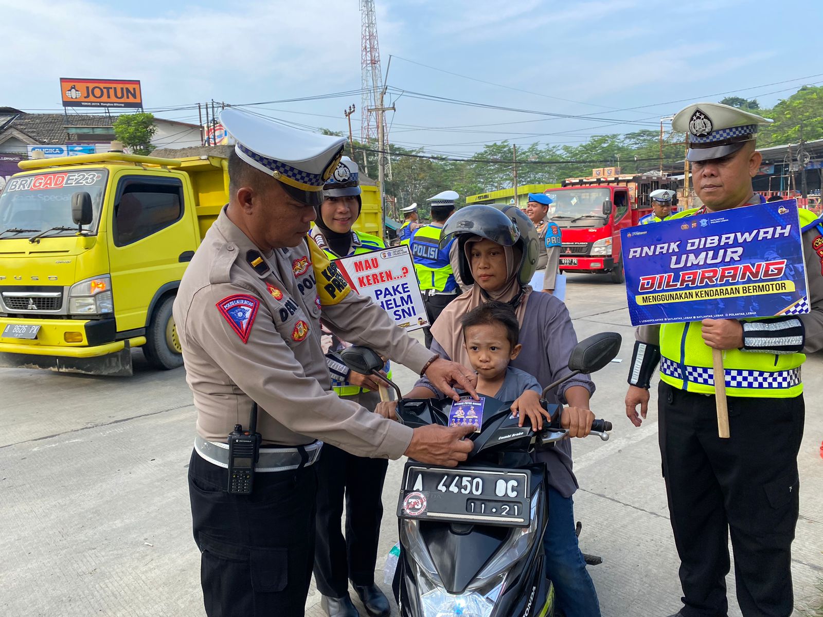 Dalam Kegiatan tersebut Personil Sat Lantas Polres Lebak Polda Banten berikan himbauan sekaligus pemasangan stiker serta bagikan pamflet ke para pengendara yang melintas.