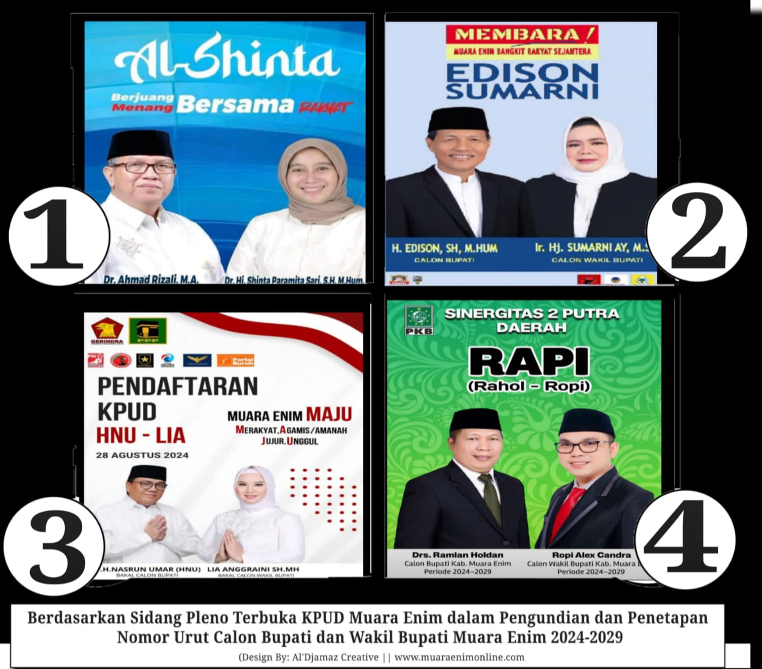 Dalam sidang terbuka yang digelar di hotel Melio kota Muara Enim, KPUD Kabupaten Muara Enim telah menerapkan 4 pasangan dengan nomor urut sebagai peserta Pilbup dan Wabup kabupaten Muara Enim tahun 2024.