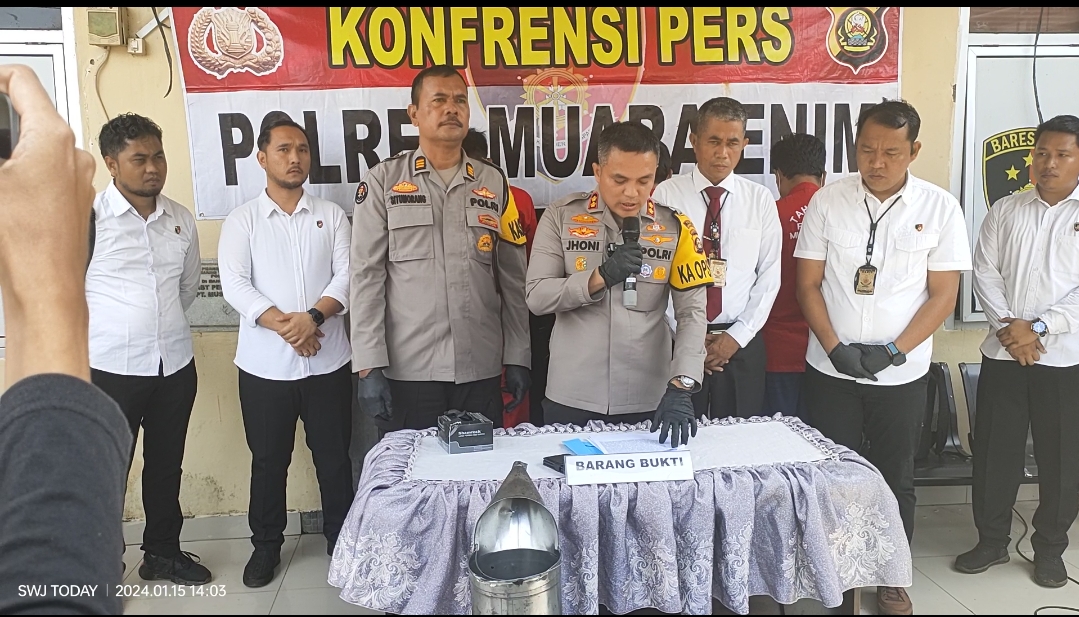 “Pelaku AS ditangkap di jalan Jenderal Sudirman Kecamatan Muara Enim Kabupaten Muara Enim tepatnya di depan Hotel Melio Muara Enim. Sabtu, 13 Januari 2024. Pukul 14.00 WIB.” Terang Kapolres Muara Enim AKBP Jhoni Eka Putra, S.H., S.Ik.,M.M., saat menggelar konferensi pers di halaman depan Satreskrim Polres Muara Enim pada Senin siang.