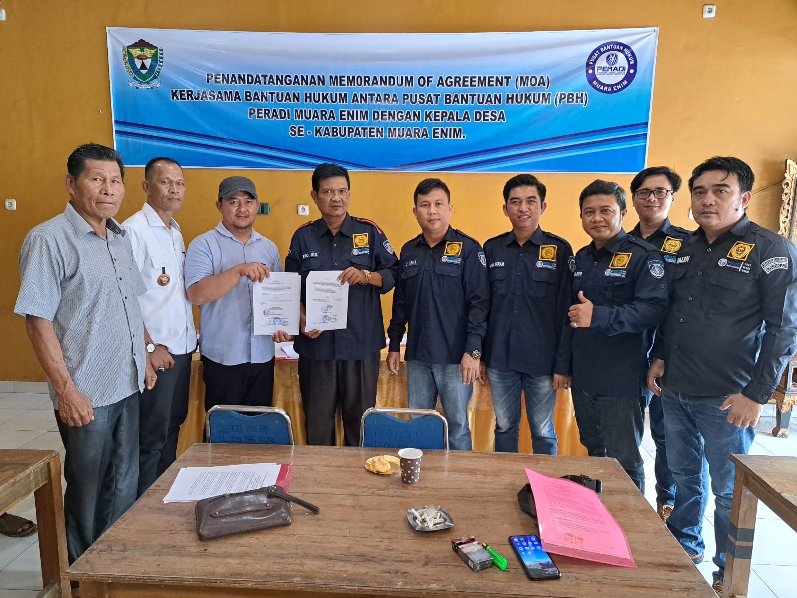 “Dalam waktu lebih kurang 1 bulan ini, sudah beberapa desa yang berada di wilayah Kecamatan di Kabupaten Muara Enim menandatangani surat perjanjian kerjasama dengan PBH PERADI Muara Enim. Yaitu, desa-desa yang berada di Kecamatan Semendo Darat Laut, Semendo Darat Tengah, Semendo Darat Ulu, Lawang Kidul, Muara Enim, Ujan Mas, Gunung Megang, Lubai Ulu, Belide Darat, dan Sungai Rotan.” Ungkap Medy.