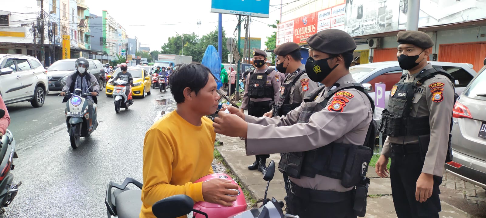 Dalam kegiatan tersebut masih ditemukan adanya warga yang melintas tanpa menggunakan masker selanjutnya petugas memberikan teguran sekaligus menyerahkan masker secara cuma-cuma.