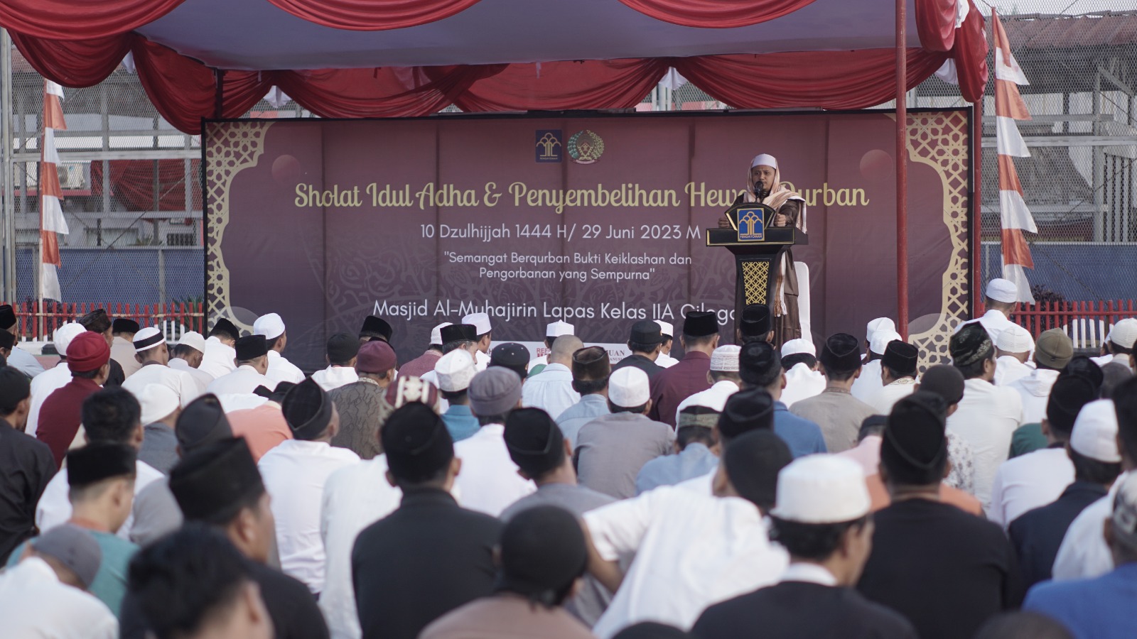 Cilegon ,”Sriwijayatoday.Com.- Momen hari raya Idul Adha juga dirasakan dengan penuh sukacita oleh warga binaan bersama para petugas di Lembaga Pemasyarakatan (Lapas) Kelas IIA Cilegon. Suasana khidmat begitu tampak jelas, saat mereka tumpah ruah memenuhi lapangan dalam Lapas, untuk melaksanakan Salat Id 1444 Hijriah, Kamis (29/06) pagi.