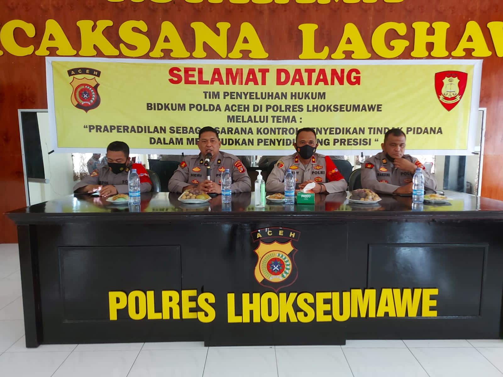 SRIWIJAYATODAY.COM | LHOKSEUMAWE – Penyidik Polres Lhokseumawe dibekali penyuluhan hukum dari Bidkum Polda Aceh dengan tema Praperadilan sebagai sarana kontrol penyidikan tindak pidana dalam mewujudkan penyidik yang presisi yang berlangsung di Aula Rupatama Laghawa Polres Lhokseumawe, rabu (3/11/2021) pagi.